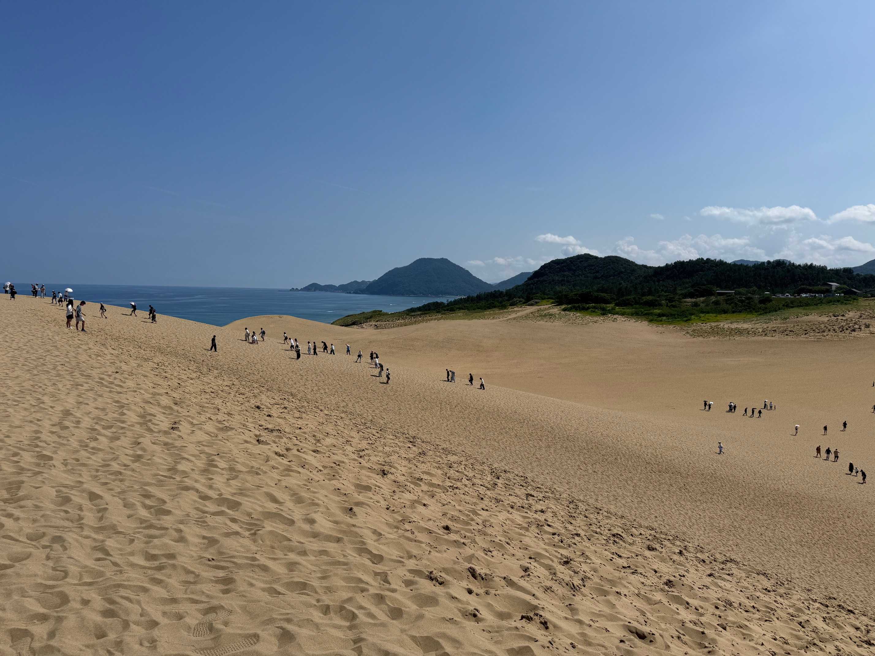 鳥取空港(鳥取砂丘コナン空港)に8時過ぎに到着。夜の試合までかなり時間があるので鳥取砂丘に行くことにした。直通の公共交通機関は無いのでバスを乗り継いで。9時半くらいに到着、それ程人は多くない。とにかくきつかったイメージでは海を眺めながら砂浜を歩く、という感じだったが海を眺められるところに行くまでに急な坂の砂浜を登っていかなければいけない。文章とか下の写真にするとたいしたことは無いように伝わるかもしれないが本当にきつい。しばらく汗がひかなかった。休憩所でしばらく休む。汗だく、靴の中は砂だらけでしばらく歩く気がしない。午前中にしてもう疲れ果てたのでもう一か所見学を予定していた所に行くのはやめようかとも思ったがせっかくきたのだし、時間もまだ早いのでやっぱり行くことにした。「砂の美術館」砂で作った建物、彫像などは見事だったが何より冷房がありがたかった一息つけたので昼食をとりに次の目的地に向かった。地場の新鮮なねたを使った「回転ずし 北海道」鳥取駅から徒歩20分ちょい。店についてみると、60組くらい待っているどうしようか悩んだがまだ時間はあるので待つことにした。今までの人生の中で食事をするためにこんなに長い順番待ちをしたのは初めてな気がする。二時間後ようやく席に通された。一人だったからカウンターに通されたが家族で来ていたら更に何時間が待たされるよう。お寿司自体は美味しかった。ただ地場の魚というより他の県の名産を運んできているようだった。さあ、今日の目的地へ向かおう。
