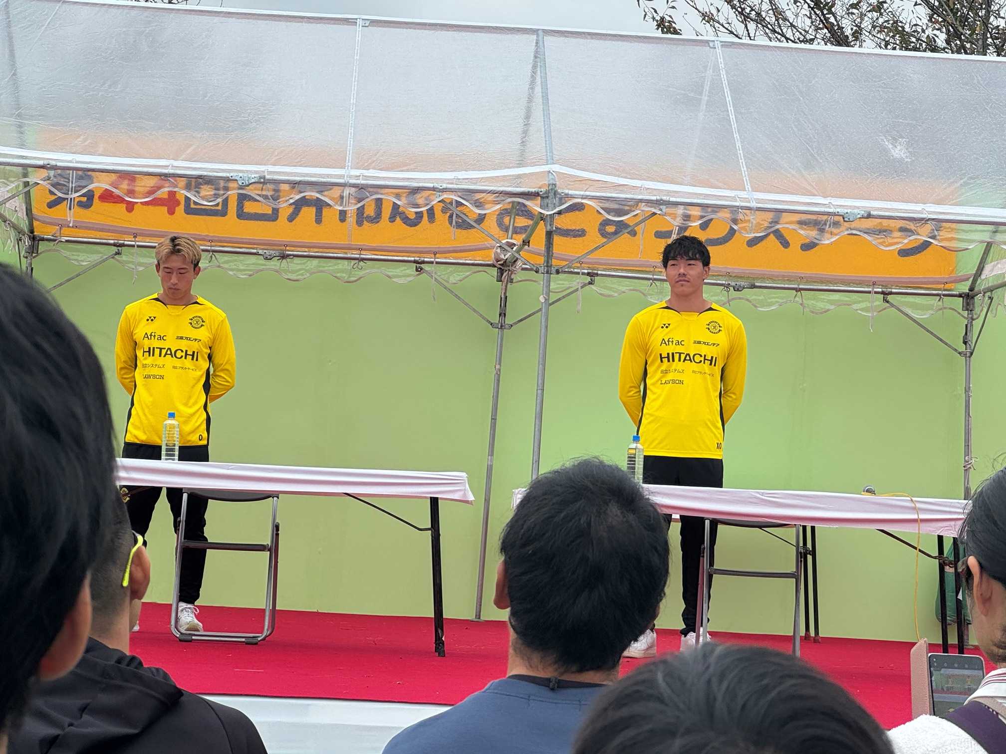 昨日美味しいパンを食べるために実家の近く(と言っても車で20分くらいかかるが)のパン屋さんに行った。帰りに実家に寄るというので嫁が母親に電話をかけてみると「今白井ふるさと祭りに来ている」という。そういえば!レイソルの選手がトークショーに来ると書いてあったっけ。調べてみるとGKの小島選手とMFの中川選手が参加とのこと。急いで会場である白井市役所に向かった。トークショーが行われる広場に到着したのが始まる15分前。席も確保できた。二人が登場。トークショー、プレゼントクイズ大会と指名はしてもらえなかったが楽しかった。それにしても小島はまじめというか真剣に対応してくれるのがよくわかった。(中川がしてくれなかったという訳ではない)前日二人とも大阪の試合でフル出場していた。試合が終った後誰がふるさと祭りにくるか決めると書いてあったがどうやって決めたんだろう。本当にありがたい。