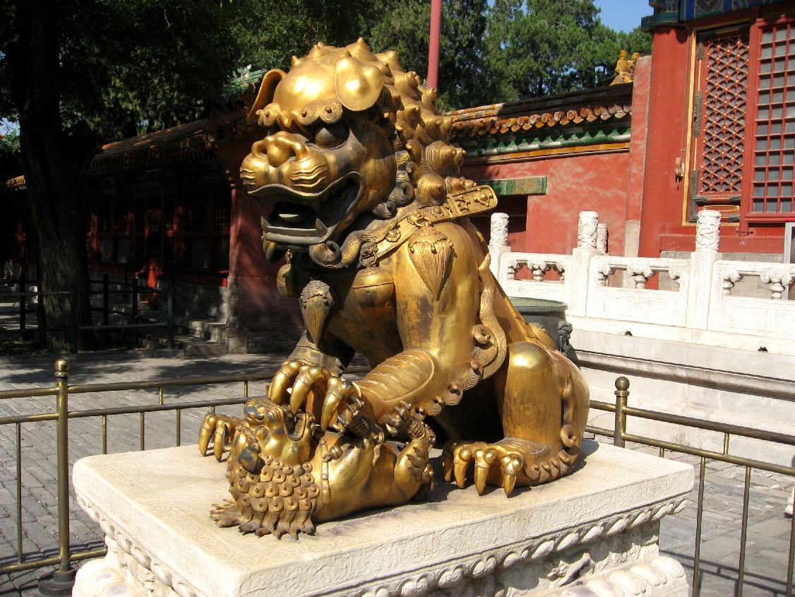 北京の青空。ガイドさんも普段は見ることができないと言っていました。国慶節の連休だから、青空が見えるそうです。中国は年々変わり、北京は日本と差はありません。しかしモラル面はこれからで、建築物などにも大きな事故が起きそうな怖さを感じます。今日は少し変わった写真をご紹介しましょう。私のブログらしく、犬猫関係の写真です。まずは犬族。【故宮 塗金青銅獅子像】左手で子供をあやしています。これより大きな像もあります。【故宮 暢音閣 京劇舞台彫刻】かつて京劇の舞台に使われました。【故宮 陶枕】【明の十三陵 獅子】神路の石像生のひとつ。本当は象,麒麟,かいち(神獣)等が面白い。次は猫族。【故宮 陶枕】【頤和園 長廊 猫】728mの長廊に多くの絵が描かれています。まったく北京らしさが伝わらない写真ばかりになりました。中国と日本の関係は、改善されつつあるのかもしれません。万里の長城のふもとにあった戦争の写真展。万里の長城近辺での、中国軍と諸外国の戦いの写真パネルと説明書きがありました。日本軍との戦いと分かる数枚の説明パネル。それだけは写真が取り外されていましたが、中国語の説明の文字は残されていました。中国語がわからない日本の観光客だけへの配慮。現地の人へのメッセージのみは残ります。いつか写真だけではなく、人の心からも反日感情が消えますように。