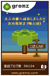 留守中に、ブログが開設9年目となりました。私のブログの開設は、2006年5月20日。しかし、開設だけして放置したので、日記を続けて書き始めた2006年7月21日を「準開設日」としています。とはいえ、当時の日記はアフィリエイトでしたが。したがいまして、準開設日7月21日で、ブログも本当の9年目に突入します。日記は、今日で2095件になりました。皆様の応援のおかげと、感謝しています。私は、まだまだブログは更新予定。私がブログを止めるのは、楽天ブログが閉鎖される時かもしれません。*グリムスも、16本目のおとなの木ができました。今回も、かなり変な形です。先日、グリムスさんからは、モンゴル植林の通知もいただきました。ブログの更新だけで、実際にリアルで植林されるグリムス。グリムススタッフさん、ありがとうございます。【gremz】 「ブログの更新で植林」*ブログにリンクがある、クリック募金も継続中。しかし、アンケート募金は、何件か回答期限を逃しました。クリック募金の総額は不明ですが、アンケート募金は5,700円。これからも、継続の予定です。*色々ありましたので、今回はお知らせ日記。明日は、通常の日記になります。ブログ9年目へ、グリムス植林、クリック募金・アンケート。いずれも継続しますので、これからもよろしくお願いします。