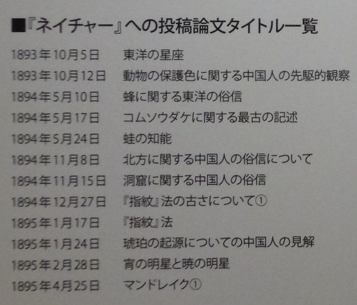 国立科学博物館で開催されていた企画展「南方熊楠-100年早かった智の人-」に行きました。多彩で活動的な熊楠について、皆さんはどのような印象をお持ちでしょうか。菌類の収集は有名ですが、熊楠の絵は思っている以上に下手です。【国立科学博物館】 「南方熊楠図 第一集」私が興味があったのは、熊楠の書いた論文。熊楠は学術誌「ネイチャー」に51本の掲載論文があり、単著では今でも日本人歴代最多と言われます。彼がどの様な論文を書いたのか。それが以前から私の知りたいことでした。展示会では、ネイチャー掲載論文のタイトルの一部が掲載されていました。当然のごとく、嬉々として、私はその写真を撮りました。見にくい写真ですが、ご覧ください。「中国人の俗信」、「貝合戦による占い」、「死者の婚礼」、「魔よけの籠」、「幽霊に関する論理的矛盾」、「タコの酢とクラゲのアラック」等々。今日では、ネイチャーにはとても論文掲載されないだろうタイトルが並びます。しかし19世紀末頃に、これだけの数の英文の論文を日本人が投稿した。その先駆けとしての偉大さは変わりません。南方熊楠。あらためて、大きな人だと思いました。