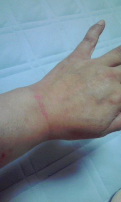 ぎょぎょぎょーっ! あっ!!手首が少し赤らんでるよ!!集団湿疹出没か!? ガムテって書いてある(爆)手を洗っても落ちなかったのね( *´艸`)マジックだからね( *´艸`)お風呂に入ったら落ちました( *´艸`)これで電車乗って帰って来たのね( *´艸`)知らぬが仏 だわね( *´艸`)
