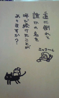 おもちゃ病院から、メールが来ました。残念ながら、退院のお知らせではありませんでした。 先生が、体調を崩され、治療が思うように進んでいないとのこと、お詫びのメールでした。 やっぱりね!先生!無理しないでくださいね!そうじゃないかなぁ~?とは心配してたんだ(´д`;)入院の相談しているとき、すでに先生夜遅くまで治療して、朝5時に起きて、退院準備(梱包)してる、っておっしゃってたもん。体、大丈夫かなぁ~?って思ったもん(´д`;) 最長、14カ月、入院している子もいるとか。。。 つーことは、エッさんもそのくらい見積もっておかないといけないのか。。 画像再利用(笑) 待ってるよ、エッさん!(´・∀・`) ノ元気になって帰って来てね~(´・∀・`) ノ 待ってろよー! 風邪ひくなよー! 宿題やれよー、歯ー磨けよー! ドリフかっ!