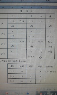 お正月休みの間に、年収計算を。この土日で、雑用計画を。 考えれば考えるほど、結果は、 無理でしょっ! って事になる( ̄∀ ̄*) まず、年収は中途半端に控除から出ないように、振替休日の多い月曜日に、仕事してても1時間前の3時にタイムカードを押してしまう。 雑用は、週1のトイレ掃除や食堂・更衣室を月2回にする。毎日1時間前(今より30分早く)に出勤し、行なう。こんな感じでエクセルで作った。 これで、修正を重ねること4回( ̄∀ ̄*)1はトイレ、とか別表も作ってある。 1時間早出(もちろんサービス)する、さらに旦那の夜バイトがなくなる。という事は、いつパソコンで遊んだらいいんだい?( ̄∀ ̄*) 毎日1時間早出にならないようにすればいいんだけど、毎日にしないと、早く家を出る習慣が付かないしなぁ~( *´艸‘) そのうち疲れるか、病気になるか、面倒になるか、で、頑張って作った予定表も、うやむやになると思われます。が、一応作りました(笑)