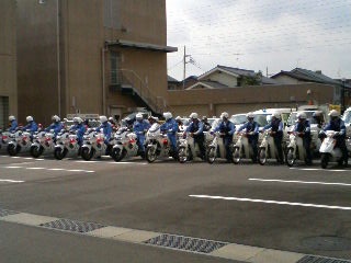 今日は「秋の交通安全運動の出発式」に参加してきました。何故か交通安全母の会の会員になっておりまして・・・・・・(・・・というのも、会からの要請で各小学校から2人選出で、PTA副会長からのご指名でお役を頂いたわけです。黄色のタスキをしっかりしてね)よくTVで見るあの出発式です。 白バイやパトカーがダァ===ッと並んで順に出発していくあれです。一体何処行くんだろうって思いましたよね~~あれ、付近を一周してそれぞれ帰ってくるだけなんです。ということで、警察署へ。もう既に白バイや交番バイクやパトカーが並んでました。こんな光景は初めてなので、婦警さんにお断りして写メをパチリカッコイイですよ~日が差してきたので日陰に避難。 この隊列の後ろに回りました。すると、そこで見たものは・・・・・立派な ハーレーダビッドソン が並んでるぅ~~~~~アレレ、これって警察の持ち物なのぉ~~~???いつ乗るのかしら・・・と、思いましたが聞きかじった情報ではボランティア団体?の方だそうで・・・アイアンイーグルスという団体名なのだそうです。ウ~ンなんか聞いたことがあります。傍らに何やら黒い集団が。皆さんお揃いの黒のつなぎに黒のキャップに黒のブーツ中には黒のサングラスの方も。フフフ、全身真っ黒。皆さん、少しお歳を召されているかしら~という感じのおじ様たち。なかなか素敵です。皆さんの自慢のMachineなのでしょうね~さて、集合がかかり配置につき(?)開式です。ありがたいお偉い様のお言葉が次々あり、その度に、「きょうつけ・注目・なおれ・休め・・・」の繰り返しで・・・・注目って・・・何?敬礼するの?などと思いながら・・・微妙な立ち加減(笑)ようやくお話も終わりいざ出陣!皆さんバイクパトカーその他モロモロに乗り込み出発~~~拍手でお見送りですハーレーにはサイドカーもしっかり付いています。カッコイイですね~その後、残った方たちで警察署前で街頭キャンペーンを・・・・・あの、ティッシュとチラシを配るんです。でも、ここって信号無いんですが・・・・・と、思ってたら、なんとわざわざ止めるんですね~~~警察署前で警官が止まりなさいと出てきたらそりゃ皆さん何事かと止まりますよね・・・で、止まったところをチラシを持ったオバサンや婦警さんやらがドヤドヤと渡すわけですよ。でも、なんだかこれって~~~ わざわざ止める方が危ないようなぁ~だって、車に乗ってる人車道の両脇に安全タスキをした警官やオバサンがズラ~~~っと並んでたら見ますよね~。で、前のほうで車が止められるんですよ~。気を取られてると前方不注意でお釜ほっちゃうんじゃあ~?ま、そこで意見するわけもいかず、早くアタシのノルマ果たさなくちゃの勢いで僅かに止まってくる車に数人のおばちゃんがどっと押し寄せるのでした・・・わずか十数分のキャンペーンでした。帰り際にお茶を頂き帰りました。なかなか経験できることではないので楽しかったです!今は交通安全週間です。皆さん普段よりさらに気を引き締めて運転してくださいね!