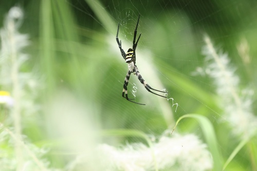 餌の確保に大変だなと同情する。チガヤの穂と蜘蛛の巣が美しかったので