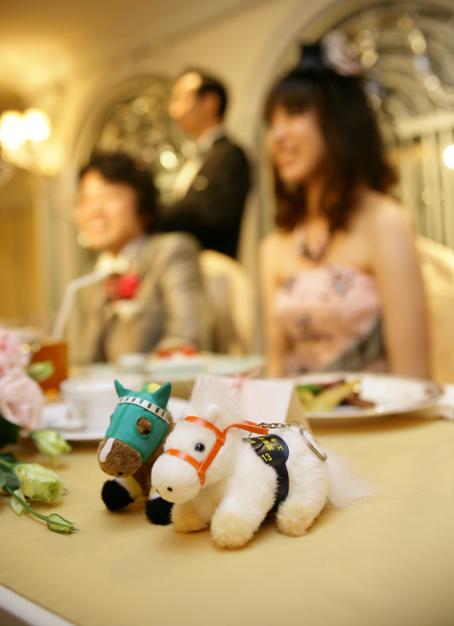 先日、披露宴の話を書こうとしたら写真がなくて断念!!とお伝えしていましたが、なんとかかき集めてきました(笑)神社での挙式のあと、私たちはちょっと変わり種で、実は披露宴を二回行ったんです。理由は3年前に離婚した母が、「家族には会いたくないけど、披露宴には行きたい!!」と難しいことを言ったから(笑)会場のプランナーさんと相談し、挙式後親族のみで食事会を開き、夕方に披露宴と2次会の間みたいな感じでパーティーを開くことにしました。最初の食事会では、特にイベントも用意せず、皆で楽しくお食事。食事の後はいろんなカップリング&ポーズで写真撮影会が始まりました。この時、父に婚姻届の証人の欄に記入してもらいました。そしてその後、友人と母を招いての披露宴がスタートしました。私たちは二人とも、「馬が大好き!!」なので、会場にも馬をちりばめることに。席札として馬のキーホルダーを使用。首に札を結びつけて、一人に一頭、プレゼントしました。全部違う馬をチョイスし、その人に合った馬を考えて配置しました。お出迎えももちろん、ウエルカムホースです(バカです 笑) 会社関係は呼ばず、友人メインの参加にしたので、イベント盛りだくさんの披露宴にできました。まず最初にケーキをみんなにデコレーションしてもらいました。しかも、2チーム対抗戦にして、新郎新婦が気に入った方に入刀することに。指名は事前に知らせておらず、ゲストは名前を呼ばれてびっくり(笑)入刀しなかったケーキは、11月生まれのゲストのバースデーケーキに。これまたサプライズで、私の妹ともう一人男性の方が対象でした。2人をはさんで「ハッピーバースデー」の大合唱^^「一生に一度の誕生日になった」と感激してもらえました♪♪次はビンゴゲーム。これもただのビンゴじゃありません。その名も「エピソードビンゴ」紙には新郎新婦にまつわる様々な問題が。正解と思う数字をマス目にうめていきます。そして問題の大半が「この中で一番早いのは誰でしょう」など、よくわからない内容に(笑)答の欄にはゲストの名前が書かれています。ここに名前が書かれている人たちにはミニゲームに参加してもらい、その勝者を当てるというものなんです。たとえばガリガリ君の早食い競争など(笑)突然指名されて、しかも訳わからないゲームに参加させられて…ゲストたちがどんな反応を示すのか、やってみるまでちょっと不安でしたが、自分が選んだ人を応援したりして、かなり盛り上がるゲームになりました^0^大まかな原案はプランナーさんから頂いていましたが、私たちならでは&ゲストならではのゲームも混ぜたので、とっても楽しくて、私はずっと爆笑するハメに(苦笑)ゲストにも大好評!!楽しんでもらえたみたいでした^^長くなったので後半は後日のお楽しみです!↓私は変身してるから良いんですが、旦那さんが顔をあんまり出されたくないみたいなので…編集しました♪(爆)