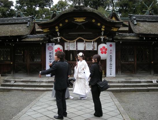 会場を決めてから8ヵ月。準備期間三ヵ月…ついにこの日を迎えました。忙しくも楽しい期間が終わるのが、嬉しいような、ちょっぴり淋しくもありました。「私はキリスト教徒じゃない!!」と友人の結婚式に参加する度に違和感を覚えていたひねくれ者の私(笑)自分の挙式は教会式ではなく、絶対神前式が良い!!と思っていました。「いまどきの人にしては珍しい」と言われたけれど、「神社」は七五三や厄払いなど、昔から親しみのある場所。そんな「神社での挙式」にこだわりをもっていました。私の中で「神社=神聖な儀式をするところ」本殿に上がるだけでピンと張りつめた気持ちになります。披露宴会場からほど近いところにある平野神社で挙式しました。京都の神社といえば、「平安神宮」「上賀茂神社」「北野天満宮」…など数々の名所がありますが、会場からの距離、撮影の可否、空き具合…などからこちらの神社に決定しました。平野神社は桜で有名で、各地のたくさんの種類の桜が植えられています。残念ながら今は季節ではありませんでしたが、寒桜がちょうど咲いていて、式に華を添えてくれました。家族より1時間早く現場入りし、沢山ロケ撮影をしました。プロのカメラマンさんが同伴してくださり、色々なポーズで撮りました。面白いシーンも沢山撮ったので、仕上がりが楽しみです♪(届いたらまた紹介しますね^^)撮影の最中、アマチュアカメラマンのおじ様軍団と遭遇!!撮影大会が始まっちゃいました。新郎とくっついてポーズをとろうとしたら、「いや、お嫁さんだけでお願い!!」と言われて苦笑い^^;移動する度にずらずらと連れて歩き、まるで芸能人になった気分を味わえました(笑)お清めの御手洗をした後、いざ本殿へ。琴の生演奏とともに、儀式が始まりました。三献の儀(さんこんのぎ)や玉串奉奠(たまぐしほうてん)など、6つくらいの儀式がありました。式が進んでいくほどに、「結婚するんだ」「両家が親戚になるんだな」という実感が、じんわりと湧いてきました。誓詞奏上(せいしそうじょう)で夫婦の契りを交わし、今後頑張っていく決意を新郎が読み上げた時には、じんと胸に来るものがありました。「夫婦になる」という実感が、本当にこみあげてきて、とても良い式だったなぁと思っています。自分が日本人であることを、とても誇りに思えました。両家の父親が代表で玉串を捧げたり、両家で杯を交わしたり…「みんなに見守られ、認められて」夫婦になる、ということをとても実感できました。また、「責任」も感じました。今日のところはここまで。次は楽しい披露宴です^^↓の写真は挙式後、カメラマンさんに「何か撮りたい場所ありますか?」と聞かれて、「あの木が良い~!!ミカンと撮りたい!!」と言って「えっ??あれ~??」とみんなにツッコまれているところです。そしてそれを実現させ、「ミカン美味しそう~!!」と思ってるところです(笑)ちなみにこの果実、みかんではなく橘だそうです。