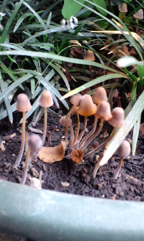 家の前に置いてある榊が植えてある鉢見たら下にキノコが生えていましたいったいこのキノコは何キノコ???