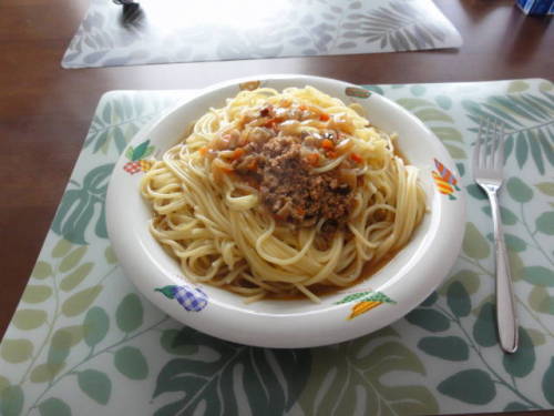 昨日のお昼ですが・・・すっごくちっちゃい幸せですけど、市販のパスタを二束分茹でて、山盛りにして食べるとお腹いっぱいになります。