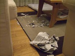 小梅、久しぶりにやってくれましたΣ( ̄ロ ̄lll) ガビーン11月に入り日が暮れるのも益々早くなってきましたね。夕方も5時になると辺りは真っ暗。私の仕事が終わり家に着く頃は当然真っ暗。それでも5時に仕事を終えダッシュで帰って5時30分までには家に着くようにしています。毎日、暗いリビングで私の帰りを待っている小梅∪o・ェ・o∪きゅ~ん♪あの日も急いで家に帰り「小梅ただいま~!」とリビングの電気をつけると・・・ やけに部屋が散らかっているではありませんか!!!そうそう今朝の新聞ですよ!新聞がビリビリですよ~(/||| ̄▽)/ゲッ!!!わたくし制服を着替えるのも忘れ急いで近くにあったコンデジ片手に事件の現場検証を始めました!?(あれ?片付けは!?)あらゆる角度から犯人の証拠を見つけようと写真を撮っていると犯人ならぬ犯犬が現れました~Σ(- -ノ)ノ エェ!? ママさん、散歩は?ご飯?こんな事を言いそうなくらいとぼけた顔して尻尾を振る犯犬!「これやったの誰!」と小梅に聞くとお決まりの反省(?)の顔! 耳を後ろに絞って私を見つめるのです・・・@(;・ェ・)@/反省…そして、あっけなく許すバカな飼い主その1(わたし)パパさん帰宅後に事件を報告するとまたパパさんにまた「やったの誰!」と聞かれる小梅∪o・ェ・o∪ パパさん怒らないで~! 許して~♪小梅にスリスリされてあっけなく許すバカな飼い主その2(パパさん)普段は本当何もしないで昼間は一人でお留守番しているのですが(ある意味それが奇跡!?)たま~にありますこういう事が!!!以前にもレポしたお留守番ワンコは・・・その1、その2はこちらです。年に数回の出来事なんであまり気にしないのですが忘れた頃にやってくれます(`□´)ノでも今回も新聞で良かった・・・ソファーやカーテンをカミカミされたら目も当てられません(。>0<。)分かっているのかなぁ~小梅は!?でも、こんな事もしていました! テーブルをカジカジ・・・(これは随分前の事なんですが)これパパさんがリメイクして作ったテーブルです~!これにはパパさんも嘆いていました~(T△T)この先、その4やその5が起きない事を願います!( ̄人 ̄)オ・ネ・ガ・イ♪(万が一の時は、また新聞紙ぐらいで勘弁してくださいね小梅!!!)