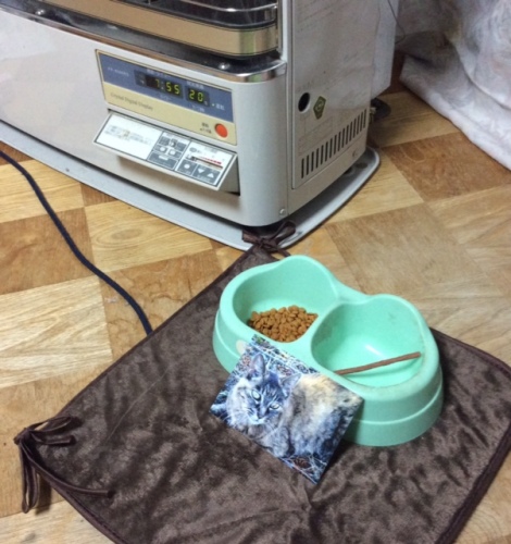 昨夜、東京から帰ると「ニャニャ」がストーブの前に座っておりました。雪が融けたらきちんとお墓を作りますが、冬には毎年この席を作っておこうと思っております。歩夢は、毎朝「ニャニャおはよう」にはじまり「ニャニャ行って来ます。」「ニャニャただいま~」「ニャニャお休み~」と、遺影に向って話しかけております。長男にこの写真を送ると、嬉しそうに「写真入れにいれて飾っておいて上げて」とメールが返ってきました。さっそく、今日仕事が終わったら買いに行くことにします。