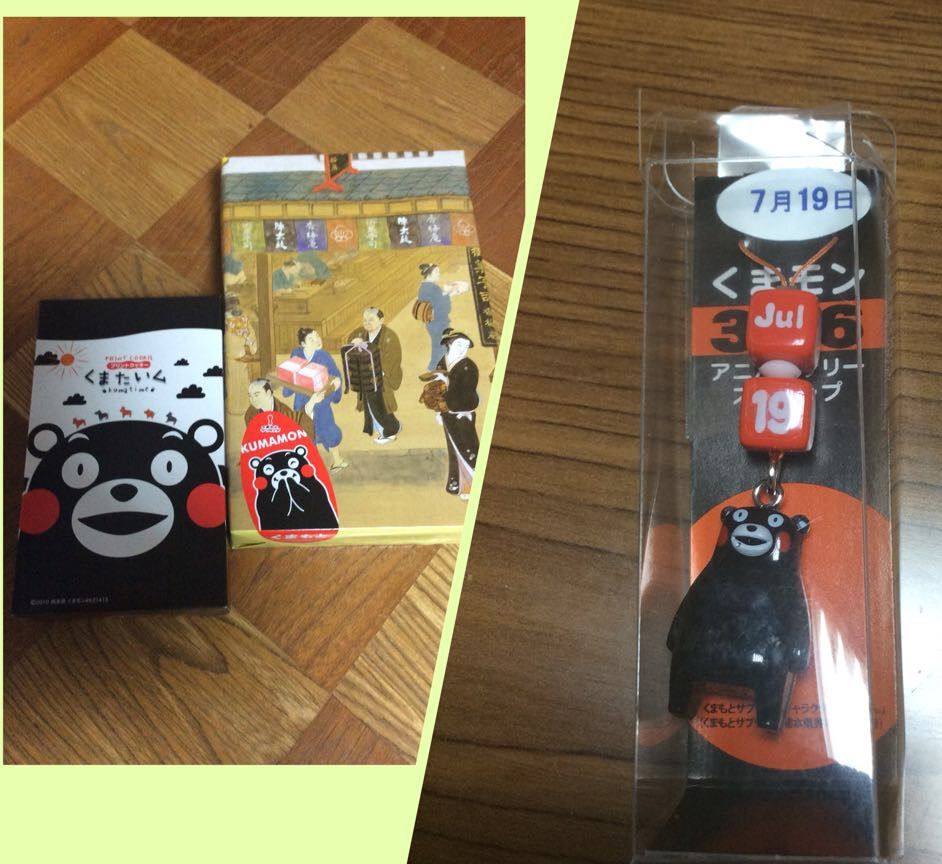 あやか、あつなからいただきました。ありがとうございます。可愛いくまもんクッキーに、熊本の和菓子では有名な香梅の誉れの陣太鼓、また歩夢には誕生日のストラップです。ありがとうございます。