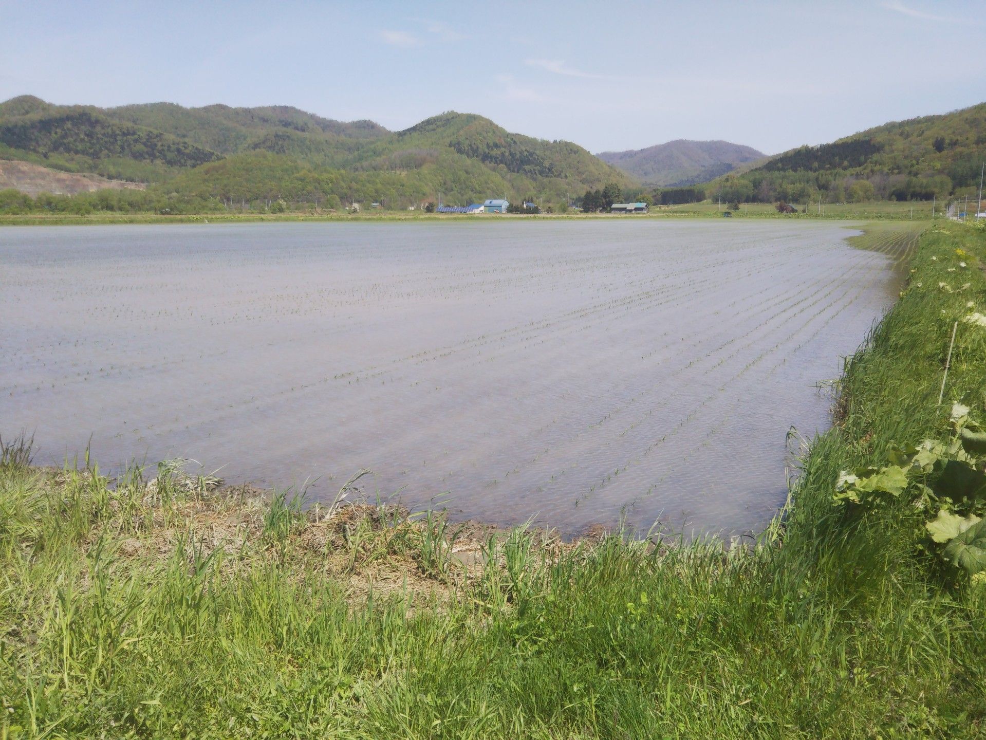 士別市上士別町の圃場(田んぼ)です。農地再編により、最大は、1辺が約135メートル×約560メートルの広大な圃場が並びます。 やっと田植えも終わりそうです。