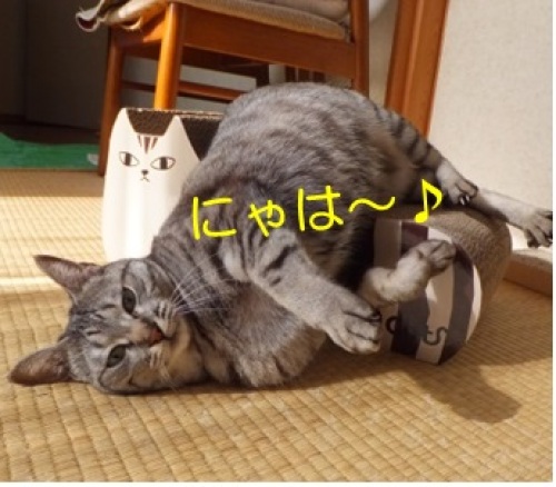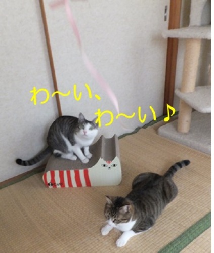 ひな祭りの絵手ぬぐいは、天井近くの高所に張り付けたおかげで無傷で回収できたことは、昨日、お伝えした通りです♪それが面白くないトラちゃんファミリー(特にミラン)から、新たなリクエストが…とらぞーきゅんと、ふたりがかりでまぁ(*^m^)おもちゃか、そうね…タワーの麻縄もかなり疲労困憊してるし…あ!おもちゃというか、段ボールの爪とぎを新調するの、どう?チャコも喜んでるね(。ゝ∀・)ゞということで、マタタビの粉を塗した新爪とぎをセッティング♪した途端、トラちゃんが1番乗りしています( ̄▽ ̄〃)おかしいな、一応母猫のはずだけど( ̄m ̄〃)横で、ミランが隙をうかがってるな~ぷっ、トラちゃん、他人のいえ、他猫のこと言えないでしょ~あ、チャコも近づいてきた♪ やっぱり、皆目敏いわね~♪ひとりを除いて( ̄m ̄〃)★ご訪問ありがとうございます★★お手数ですがポチッとお願いいたします♪★◆ペコ用◆トラちゃんファミリー用