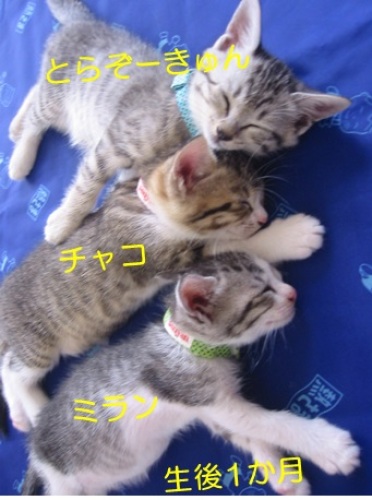 おはようございます♪これは、トラちゃんの3姉妹を2010年8月19日に撮った写真です。まだ体重も500グラムくらいで、小さくて愛らしかったです♪首輪もちゃんと、仔猫用の物をそれぞれ色違いで購入♪柔らかくて、仔猫の首に負担がかからないものです。それから、2年8か月が過ぎ、今では、3姉妹揃って、きっちりメタボリータに成長( ̄▽ ̄〃)ということで、筋肉も強くなってますので、気に入らない首輪を外すことなど、朝飯前ってわけです!3姉妹では特に、とらぞーきゅんが首輪嫌いです。ミランも嫌いな方ですが、とらぞーきゅんほどではありません。何度つけ直しても、上手に口と手(前脚)を使って外します…まぁ、外に出さないし…とりあえず、いっか~…ペコと亡きマルも、首輪を外さなくなったのは、確か…15歳を過ぎてからだったっけ( ̄▽ ̄〃)ま、まぁそれはともかく(≡ε≡;A) …とらぞーきゅん、これはオモチャじゃないんですよ~?え、とらぞーきゅんじゃない?…誰の仕業かしら~、ねぇ~チャコ(≧m≦)【おまけ】昨日はホワイトデーでしたが、何も用意してもらえなかったのでセブンイレブンで、これらを買ってもらって食べました♪ ★ご訪問ありがとうございます★ ★お手数ですがポチッとお願いいたします♪★ ♪今週からバナー画像を、リクエストされたモノにしています♪ ♪今後、毎週日曜日に変更予定です♪ ◆ペコ用:リクエストいただいた方々moyatodoさん、CATMOONさん、ひなたうさぎ555さん、ココナッツ0403さん、flamenco22さん◆トラちゃんファミリー用:リクエストいただいた方レオン&まいあ さん ★リクエストいただいた方のHNを表示させていただいてますが HN出しがNGであれば削除しますので、お知らせください★
