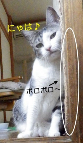 2Fのトラちゃんルームのドア枠…親子4匹で、爪とぎ代わりにしてくれて、ボロボロです( ̄▽ ̄〃)(ミランも、両手の間の余多肉が目立つ( ̄m ̄〃)どうも、母猫トラちゃんが、3姉妹をけしかけていたようですが、にゃんこ爪とぎなどを頂いてからは、収まっています。それにしても、トラちゃんたら、注意する立場なのに、子どもたちと、一緒になって遊ぶんだから~困ったものです(^^:;えぇ、間違いなく!先月3姉妹揃って3歳になったというのに、未だに、仔猫よろしく何かと子どもたちを毛繕いする、トラちゃん!その、証拠画像はこれらですよ~♪高速なので、ブレてます~とらぞーきゅん、手足が長いので、トラちゃんよりも明らかに、「背」が高いですね( ̄▽ ̄〃)ね?これらを見てわかるでしょ、どんだけの過保護ママかって~何が?あぁ、もちろん、1番、過保護な親は…その通り(≧m≦) ★ご訪問ありがとうございます★ ★お手数ですがポチッとお願いいたします♪★ ♪バナー画像は、リクエストされたモノを使用しています♪ ♪毎週日曜日に変更しています♪◆ペコ用:6/19の「顎がかけやすい編」リクエストいただいた方:ココナッツ0403 さん◆トラちゃんファミリー用:6/19の「確かにねぇ編」リクエストいただいた方:ココナッツ0403さん