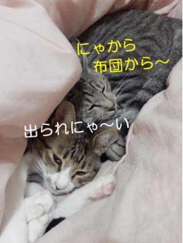 有袋類になっている、トラちゃんです(ノ∀≦。)だからといって、お父さんが「最強兵器」というわけではありませんこの少し前のトラちゃんファミリーですが、親子4匹で、お父さんのベッドで猫団子になっていました。それは…布団乾燥機をかけているからです( ̄m ̄〃)ほら、明日も早いから、そろそろ自分達の布団に戻ってくださいね~4匹にあっさり拒否されたお父さんが気の毒なので、ファミリー専用羽毛布団にも、最強兵器の布団乾燥機を投入!すかさず潜り込んでいるのは、チャコでしょうか?めくって確認してみると~いや、ミランだったようです(*≧ω≦)こーゆーとき、のんびりしている、トラトラコンビは…お父さんが、デリバリーしてきました~以上、冬の最強兵器は布団乾燥機!という、お話でした(≧m≦) ★ご訪問ありがとうございます★ ★お手数ですがポチッとお願いいたします♪★ ♪バナー画像は、リクエストされたモノを使用しています♪ ♪毎週日曜日に変更しています♪◆ペコ用:8/12の「お父さんに抱っこ編 リクエストいただいた方:レオン&まいあ さん、元お蝶夫人 さん◆トラちゃんファミリー用:9/5の「3姉妹セーラー服編」リクエストいただいた方:レオン&まいあ さん、flamenco22 さん
