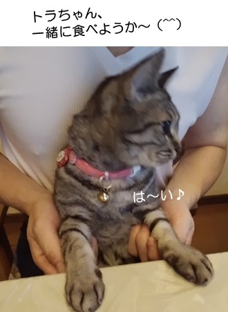 先月の27日のこと。ブロ友さんのレオン&まいあさんが3年ぶりに、kumaru04家にいらしてくださいましたぁ~(〃▽〃)昨年は私が宇和島のレオン&まいあさん邸にお邪魔したので、ちょうど1年ぶりの再会、相変わらずの美魔女っぷりです(^^)とはいえ…あれ、そこはkumaru04家じゃないんじゃ?そこのあにゃた!(どなた?)さすがでっす♪そう、最寄り駅にお出迎えしつつ、例の場所に付き合っていただきました、そう…動物病院です(*≧ω≦)事前に、良ければ付き合ってもらえますかにゃ?と、打診したところ、快くチャコの健診に同道してくれました。ついでにといいますか~レオン&まいあさん家の可愛い子ちゃんの目に、気になる症状があるそうで、質問などにも答えていただきました。幸い、金曜日の午後一は空いていることもあり、丁寧に対応してくださったからか、「優しい信頼できる先生だね~♪」と喜んでくれました(^^)そして、帰宅してから改めて、チャコ抱っこ♪う~ん、結構いい感じに抱っこされてますねぇもちろん、病院に一緒に行ったというのもあるでしょうが、3年前もペコの次に長時間抱っこされてましたからね(^^)その時は、我が家のにゃんず、全にゃん制覇には至りませんで、今回はどうでしょうか( ̄m ̄〃)ということも気になりますが、その前にまずはディナーへGO♪前回はご案内できなかった、女子会でおなじみのフレンチです。レオン&まいあさんは、チキン系(フォアグラも)が苦手なのでそれらを抜いたメニューをお願いしました。ペリエで再会を祝して乾杯したあとは~美味しい手作りパンを食べてコースを待っていると~先月の女子会でも出たプチシューは若干胡椒が抑えめでした。そして、前菜はサーモンのオーロラソース♪サーモンも美味しいですが、こちらの野菜は地物なので新鮮で美味しいです(^^)いつもだとこのあたりでフォアグラが出るところですが…珍しくも、北海道産のイシ貝がクスクスを従えて登場。クスクスの食感は好みがありますが…主にバジル風味のイシ貝は美味しかったです。続いても海鮮です。こちらでは初めていただく、マコガレイのロースト♪香ばしくてトマトと合っていました(^^)今回のメイン、お肉料理はステーキでした♪牛モモステーキのワインソース、柔らかかったです~…が。レオン&まいあさん的には、量が多かったようです(^^:;でもね、入っちゃうんですよねぇ、デザートは(*≧ω≦)サーブの際、桃と聞いて食べ始めたものの…?フランスのなんとかいう桃で(忘れました(^^:;)日本の桃とは全く別物、珍しく美味しくいただきました(^^♪さぁ、お腹いっぱいになったところで、kumaru04家にリターン♪栄養補給がバッチリのレオン&まいあさんは、果敢に、kumaru04家のアマゾネスに立ち向かいました(*≧ω≦)まずは、お父さんベッド側の窓辺に隠れるミランを探し当て~見事に抱っこ成功♪ん~それにしても、あの細腕で…よくまぁ、巨漢のミランを抱っこできたと感心仕る(・´艸`・)その上、トラちゃんのブラッシングにも成功♪その木製ブラシは先月、トラちゃんのお誕生日に、レオン&まいあさんからいただいたものです。それがわかるのか、トラちゃんもご機嫌でした♪そうこうしているうちに、お父さんも帰宅したので、ケーキを食べながらしばらし歓談して、台風12号の動きを気にしつつやすみました。It continues next time. ☆ご訪問ありがとうございます☆ ☆お手数ですがポチッとお願いいたします☆にほんブログ村