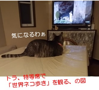トラちゃんはTVが好きです。お気に入りは、やはりこちら♪岩合光昭さんの「世界ネコ歩き」です(*≧ω≦)ちなみに、ミツコは「さわやか自然百景」で、私は言うまでもにゃく大相撲に高校野球なので、NHKばかり。ほら、払ってる受信料の元は取りませんとね( ̄∀ ̄*)とはいうものの、トラちゃんがネコ歩きを観る場合は、他に気になることがあるからのようです。ん~それ、何年も前から言ってませんか?それこそ、ペコが元気な頃から(^^:;という母の疑問を解決してあげよう立ち上がったミラン。おもむろに椅子から降りると、颯爽とTVに近づきました。えぇ、確認に行ったのですが…だから、誰もいませんってば(^^:;以上、ネコとってTVは不思議なモノ、なのでした~ ☆ご訪問ありがとうございます☆ ☆お手数ですがポチッとお願いいたします☆にほんブログ村