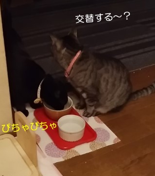 昨夜、トラちゃんとミツコが仲良くお水を飲んでいました(^^)実はこの少し前、お水を飲むミツコの頭を、トラちゃんがペロペロしてあげていたのですが、間に合いませんで…→やっぱりトロいのにゃ~ byミランそれですね(^^:;トラちゃんが交替する?と誰かに声をかけたかと思うと、さっさとどこかへ行ってしまいました。ミツコはトラちゃんがいなくなって寂しいようですが、さて、3にゃんのうち、どのお姉ちゃんが来てくれるのでしょ?あ♪チャコでした~(=^・^=)近づいたかと思うと、いきなりのペロペロ攻撃♪もう飲まなくてもいいんじゃないかな~と思うのですが、優しいチャコ姉ちゃんに誘われて~嬉しくなったミツコは、もう少しお水を飲むことにしたようです。ただ…お腹をこわさなきゃいいなと思うのでした(^^:; ☆ご訪問ありがとうございます☆ ☆お手数ですがポチッとお願いいたします☆にほんブログ村