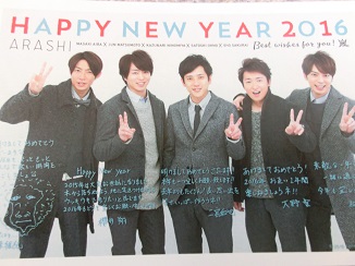 いつも訪問ありがとうございます。+ + +嵐さんからきた年賀状です♪ファンクラブに入ってると、みんな送ってくるようです!!それを忘れていて、初めて見たときはびっくりしましたが、すぐに思い出して嬉しくてニヤけちゃいました嵐さんは、今年4月から、9年ぶりとなるアリーナツアーが決定しています。すごい争奪戦になると思います。行きたいな~最近、私と娘では当たってない嵐さんのライブ。今年は当たるといいな~ランキングの下に、「【送料無料】ワンピース・ミモレ丈スカート2246円込ほか!!」が載せてあります。見てみてくださいね!!「ブログランキング」に登録してます。↓ ↓ ↓ほんとに感謝しています今日も応援お願いしますありがとうございます!とても励みになります↓ コチラ、私も持ってま~す♪ ↓入会者全員にポイントプレゼント【送料無料】アンゴラリボンプリーツワンピース【送料無料】ボトルネックサイドスリットニット【送料無料】フリル飾りチェック柄ワンピース【送料無料】ミモレ丈スカート【送料無料】Vネックプルオーバー&ニット【送料無料】タートルネックニットワンピースショップ:日記一覧はこちらからどうぞHOMEに戻る