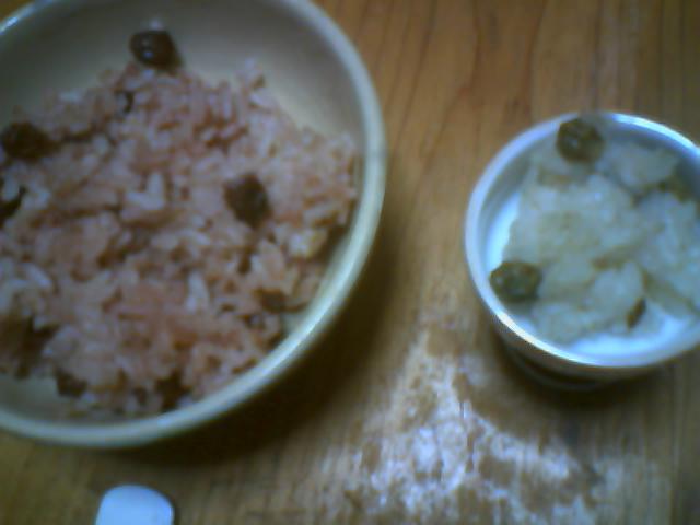 これはツタンカーメンの豆というエンドウ豆に似たのをごはんにいれてたいたもの。焚いてすぐ仏壇にお供えしたのと翌日電気がまに残っていたのを見比べていただくとわかるけど、翌日は赤飯状態になっている!!味もいい!