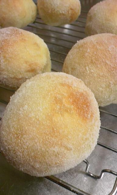 designed by *ま~ぶる*みかさんのリッチパンで二次発酵はなく一次発酵後10分のベンチタイム後に焼成~こんがり焼きあがったパンに発酵バターを塗って上から たっぷり グラニュー糖揚げてないのに揚げたようなパンになりました。designed by *ま~ぶる*美味しそうなのでもう一枚。designed by *ま~ぶる*一次発酵だけなので、もっちり感が強く 超スピーディ~~