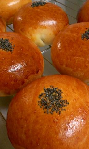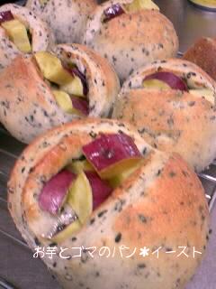 design++dalu++ img赤ずきんちゃんの散・歩・道門間みかさんのイーストでのパン。サツマイモをバターと砂糖でグラッセしてゴマパンの生地で包みました。・・・ホクホク・・・今の季節のパンです::: さつまいものゴマパン :::