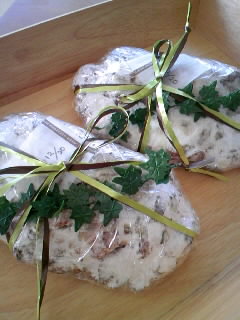 design++dalu++ img赤ずきんちゃんの散・歩・道****20日に焼いた初めてのシュトレン。今日、イブで4日目。そろそろ味が落ち着く頃のよう。なので、ラッピングしてみました。プレゼント用です。まだ、食べてはないのだけど・・・。:::シュトレン?シュトレーン?:::画像