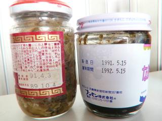 お義母さんにはお抱え冷蔵庫が3台もあります 1台は私が嫁にきた当時からあるものです いくら言っても「まだ使える」と言い 断固として処分を拒否してました 中身も自分専用の物をキープしていて 私達には触らせませんでした(勝手に触るとお小言が・・・) 何が入っているかというと 漬物、味噌漬け、乾物、もち、その他とりあえず作った物・・・ アイスやジュース、パンにチョコ、、、 ほとんどの物が未開封・・ 普段の食事は私が用意した物を食べてます 先日 義母が外出している時に久々に扉をあけてみると なんということでしょう・・・・(どこかで聞いたようなセリフですが・・) というよりも ぎゃ~~~~~ なんじゃこりゃあーーーーーー 色んな物が化石状態・・・ たぶんお肉であっただろうと思しき物・・ 液体化してしまい原型をとどめない物・・ アイスってここまで小さくなるもんなんだ。。。と たまに感心したりして...... でももうほっとけない なだめてすかして 主人に懇々と諭してもらって やっと処分する気になってくれました ただ処分するのは私の仕事・・ マスクに二重手袋・・完全装備でいざ出陣! 義母はというと・・ 「あ~こんなん入ってる~」「こんなとこにあったー」 「これまだ食べられるよな?」・・・・・・・・・と超ハイテンション・・ 頼むから いい加減にあきらめて~ 半日かかってやっと中身を片付けました 何の匂いが染み付いたのか エプロンが妙に匂います 中身の一部です 海苔の佃煮とメンマです ね~ この賞味期限・・20年近く前ですよ・・ ほぼ化石です