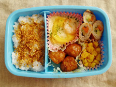 茶色いおかずなのに ご飯に工夫できなくて 茶色いゴマ(しょうゆ味)をふりかけてしまった(笑)