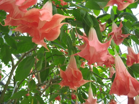 熱帯性スイレンゾーン内に植えられたほかの植物エンジェルス・トランペットと言うらしいです。なるほどのかたち。中のちっこいのだけが花なのかな。