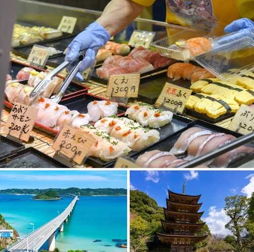 ネットからお借りした写真は 下関の唐戸市場と角島大橋と五重塔です。