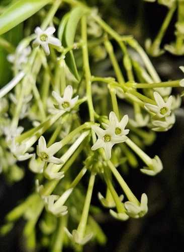数日前、ご近所から電話があり「夜香木(ヤコウボク)が咲いて、いい匂いだから来ない?」7月に咲いてるのを見たけど あれは狂い咲きでやっぱり9月~10月の花だったんだわ。夜香木の花、別名ナイトジャスミン。小指の爪ほどの小さな星型の花が 夜の闇の中に香ります。咲いていない昼間は匂わないけど むせるような甘い香りを夜風に吹かれてお隣さんと2人で楽しみました。ジャスミンよりも匂いが強く、咲いてる枝を1本貰って帰り花瓶にいけたら夫が「匂いが強すぎるから 玄関に持って行って」と言いました。庭で風に乗って香るのはいいけど 部屋の中には置けないですね(^-^;お散歩途中に 今年は白い彼岸花を見てないわ~ とご近所さんに言ったら「ウチにあるよ。奥の方に咲いてるから見て!」あらま。こんな近くに咲いてたの。ここにもあちらにも。来年はもっと増えてるよって。白は赤より強いよ って言ってました。散歩道にはこんな、ジブリの森のような場所もあります。車も人も自転車もバイクも通るし 家も田んぼもあるのでここで立ち止まって写真を撮っている私は 不思議そうに見られてるかな(^-^;わたし的には「赤毛のアン」のお化けの森のイメージで好きなんですここにはカラスウリもあるし、こんな実も。別のお宅の塀の隙間では、オリヅルランの花も顔をのぞかせていました。なかなか楽しいご近所散歩。2000歩ほど歩くだけで こんなにいろんなお花に出会えます