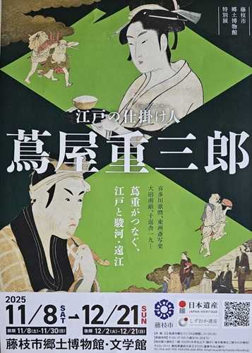 14日(金)は風もなく暖かい小春日和でした夫と午前中から車でお散歩場所に出かけて帰りに藤枝市の蓮華寺池公園にある「藤枝市郷土博物館・文学館」へ。これが見たかったのです。チラシの裏です。スターバックスもある駐車場に車を置いて 博物館に向って歩きます暖かくて 上着を着ている人もあまりいません。茶色の建物が博物館です。暗くなるとライトアップがあるので 竹細工があちこちに。到着しました。私は500円、夫はJAFのカード提示で400円。中は撮影禁止で、まずは蔦屋重三郎とは?っていうビデオを見ました。NHK大河ドラマ「べらぼう」を11ヶ月見て来たおさらいのようなビデオと展示品の数々に 夫も私も興味津々大河ドラマも残り少なくなり、重三郎も長生きではないのがわかってあらま、ここからどうなるんだろうと気になります。ショップは撮影OKと言われました。こういうものや蔦屋重三郎に関する書物がこんなに沢山!NHKのパンフレットもありましたよ。田沼意次の地元は牧之原なので、近いうちに「牧之原市資料館」で田沼家ゆかりの工芸品や古文書、歴史資料など見に行きたいです。田沼意次=わいろ政治のイメージだったのだけど渡辺謙さんと宮沢氷魚さんのおかげで(笑)、イメージが大幅UP田沼意次は元々イケメンで その男ぶりの良さでのし上がったってこともあるのですね。「江戸の仕掛け人 蔦屋重三郎」は藤枝市郷土博物館で12月21日まで。大河ドラマ「べらぼう」放送中なので楽しめます。ところで先日東京のお土産に貰った 東京都府中市「青木屋」の「あんバターどら」。このお店、創業明治26年の老舗だそうです。粒あんたっぷり、美味しかったですよ美味しい中身が見えないのでHP写真です(*^^)vありがたやまでございました