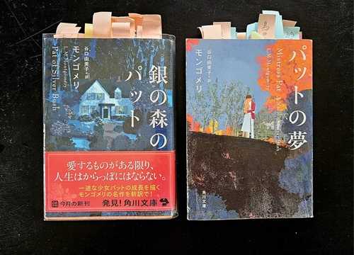 11日(土)は名古屋の鶴舞図書館で「パットの夢」の読書会でした。今年の5月は「銀の森のパット」を熱田図書館で。その続編が「パットの夢」です。「銀の森のパット」568ページ 「パットの夢」551ページ。結構な長編です(^-^;「パットの夢」の解説文から。「生まれ育った銀の森屋敷を切り盛りするパット。愛する家族に囲まれて幸せなはずだったが、兄たち、そして妹までが結婚することになり周囲からは「売れ残り」と陰口をきかれるようになる。この人こそは・・・そう何度も思いながら なかなか結婚にたどりつくことができない。そんなパットが最後に手に入れた真実の愛とは?」読書会用のノートを持参しています。自分が好きだった言葉、言い方、疑問点、思ったことなど書いてあるのでそこは恥ずかしいので隠しました(笑)この物語はパットが20歳から31歳までのお話し。「最初の1年」から「11年目」までが目次になっているので年齢がわかりやすいです。モンゴメリの小説は 恋愛がとにかくじれったい(^-^;住む家に執着して変化を嫌い、自分のことだけでなく人の人生にも変化を嫌う。何よりも「銀の森屋敷」を愛して生きてきたのに 火事でその家が焼け落ちるのは流れとして乱暴だしショックだけれど、その先に本当に大切なものが見えてくる。10人の参加者が順番に感想を言い、その間に誰かがちょっと意見をはさんだり自分が気が付かなかったことを教えてくれたり すごく面白いそれぞれ持ち寄りのお菓子がこんなに沢山 飲み物は持参です。食べたり飲んだりしながら 読書会は進みます。 「パットの夢」の本がいろいろ。村岡花子さん訳では「パットお嬢さん」で私のは谷口由美子さん訳の「パットの夢」というタイトルになっています。読書会は村岡さん訳や谷口さん訳を読み比べたり この部分はこうなっているとかかなりマニアックに深掘りするので、ここに書くのはやめますがドラマ「相棒」の杉下右京さん並みに みんな「細かいことが気になる性格」ですパットの瞳は琥珀色、という表現が出てくるので 富山のKeikoさんが大切にしているお母様の琥珀のネックレスを持ってきてくれました。こういう色なのね、と想像の翼が広がりますそして私は久しぶりに「かそけく」という言葉を本の中で見つけました「かそけく」→ほのかに という意味です。「かそけく淡い夜明けが見られる。」という文章の次に美しい風景描写が続き「神さま、ありがとうございます。 この世にまた4月を送って下さって・・・」というパットの言葉は 4月生まれの私にはとっても嬉しくてプリンスエドワード島の4月はまだ冬の季節なのでますます嬉しい気持ちになりましたランチの時にI氏が持ってきて見せてくれた本の写真です。私が見たいといったばかりに、重い本を何冊もありがとうございました(*^^*)これが「赤毛のアン」の初版本レプリカ。I氏の文庫本。欲しいけど私は買えない『世界名作劇場』の家と間取りは今年の8月2日に発売。「赤毛のアン」の2ページだけ、お隣に座った友人にページを押さえて貰って撮りました(^-^;読書会は盛り上がって面白くて時間を忘れ、4時過ぎの新幹線に乗りたかったので3時半過ぎて 慌ててお先に席を立ちました。雨はあがり帰りのこだまは空いていて 豊橋で降りるChiekoちゃんとお喋りの続きを約30分(笑)この日も盛りだくさんで、楽しくご機嫌な帰宅でした♪
