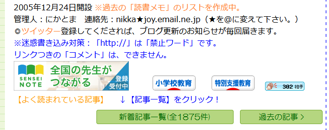 質問や問い合わせがどれくらいあるか分からないのですが、今まで載せていなかった僕のメールアドレスをブログのトップに載せることにしました。今ブログのトップページ(https://plaza.rakuten.co.jp/kyouikuuseful/)を表示すると、こんな感じになっていると思います。今まで、連絡したかったけどメルアドが載っていないから控えていた方、どうぞ遠慮なくご連絡ください。基本的には毎日夜にメールチェックをしていますが、遅くても、2~3日中にはチェックできると思います。なお、ブログやホームページにメールアドレスを載せると、一気に迷惑メールが押し寄せることになります。その対策として、メールアドレスの一部分だけを変更しています。(アットマーク@を★に変えるという、一般的によくあるパターンです。)ご連絡の際は恐れ入りますが、メールソフトの宛先にアドレスをコピーした後、★印のところを半角英数で@とお入れください。(この文の中の@をコピーして貼り付けてもOKです。)にかとま nikka★joy.email.ne.jp