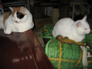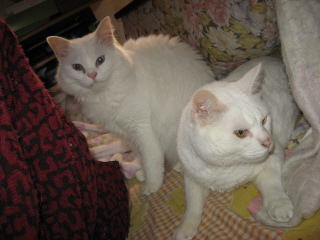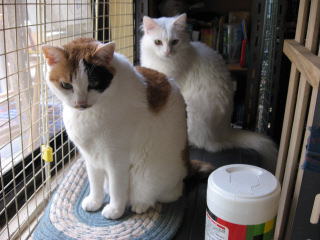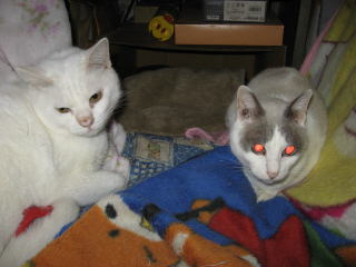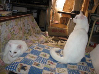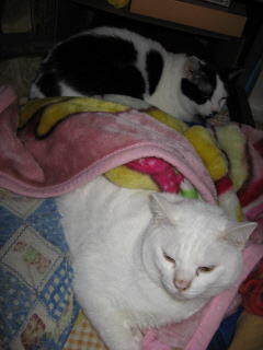 左のミコ♀は、眠そう~かな?右のナツ♀は毛つくろい中!なので、変な顔になってるよ~。ごめんなさい!体調がイマイチなので、皆様方の所へは、お邪魔できたり、できなかったりになってます。m(__)m8日は何かあったかな??今朝の最低気温はマイナス1.1度~。最高気温は18.5度。朝から晴れ~~。日中はポカポカと暖かかったよ~。昨日7日の冷え込みで、またまた体調がイマイチ。寒さで、右膝が痛くなった~。( p_q)エ-ン猫達のケージの中のトイレの掃除に、フードや水の取替えをやってると、立ち上がる時に膝に痛みが走るんだよね。今日8日の日中のように、ポカポカと暖かい日が続くと、膝の痛みも和らぐのになぁ~。様子見(=^-^=)達は、ウンチッチ♂スリリン♀ふく♀ホワイト♂あい♀の5匹毎日の飲み薬(=^-^=)達は、ウンチッチ♂スリリン♀ふく♀ホワイト♂の4匹4匹の薬は、缶詰に混ぜてます。只、スリリン♀は缶詰を食べないことが多いから、薬を飲ませることが難しいです。2日に1回の薬はあい♀旦那がシッカリ持って、σ(^_^)アタシがシリンジで飲ませてます。まだまだ手がかかってます。申し訳ないですが、暫くは、コメントへのお返事は無理みたいです。度々で、ごめんなさい。