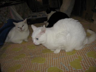 華♀スチール棚の上で、ちょろっと舌をだしてるョ。色が色だから、分かりずらいかも~~。こちらは雄♂?大♂?どっちか分からないけど、ちょろっと舌をだしてるョ。多分。。。大かなぁ~?後ろは蘭♀現在、1枚目の画像が×になったまま~~。(´ヘ`;) う~ん・・・朝までには、見えるようになるのかなぁ~?FC2に画像アップしてるけど、×になることが多いよねぇ~。はぁ~・・・(´・`)連絡メールは猫22匹と自然がいっぱいの我が家←もう一つのσ(^_^)アタシのブログです。ここに入って、右側の少し下の方にあるメールフォームから、連絡下さいね。(*・.・)ノ ヨロシクニャン・:*:・゜'★.。・:*:・゜'☆♪3月31日は何かあったかな??今朝の最低気温は5.9度~。最高気温は12.2度。31日に日付の変わる少し前から降りだした雨は、朝起きた時には、もう上がってた。午前中は晴れ~~。午後からは、晴れたり曇ったり~。風の強い、肌寒い一日になりました。夕方から、グングン気温が下がってて、{{{{(+_+)}}}}寒ううぅ~いです。様子見(=^-^=)達は、ウンチッチ♂スリリン♀ふく♀ホワイト♂あい♀の5匹毎日の飲み薬(=^-^=)達は、ウンチッチ♂スリリン♀ふく♀ホワイト♂の4匹4匹の薬は、缶詰に混ぜてます。只、スリリン♀は缶詰を食べないことが多いから、薬を飲ませることが難しいです。2日に1回の薬はあい♀旦那がシッカリ持って、σ(^_^)アタシがシリンジで飲ませてます。まだまだ手がかかってます。申し訳ないですが、暫くは、コメントへのお返事は無理みたいです。度々で、ごめんなさい。