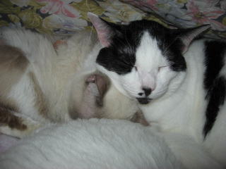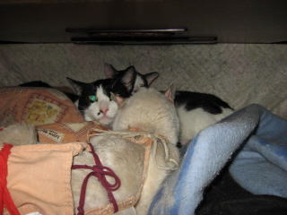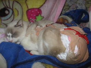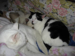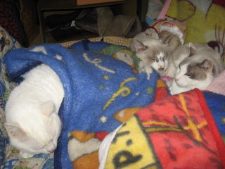 手前は寅♂左上は、ウンチッチ♂の頭を枕にして寝てるのはデコ♀11日は何かあったかな??今朝の最低気温は11.8度~。最高気温15.4度。昨夜からの雨は、降り続いてま~~す。ザーザーと降ってました。その雨も、午後3時頃には上がったョ。σ(^_^)アタシの体調は、まだイマイチ。日記も簡単で~~。今朝はしんどくて、お昼前まで、身体を休めてた。だから午後から、バタバタ~~でした。でも、手抜きしながら、何とかやってました。様子見(=^-^=)達は、ウンチッチ♂スリリン♀ふく♀ホワイト♂あい♀の5匹毎日の飲み薬(=^-^=)達は、ウンチッチ♂スリリン♀ふく♀ホワイト♂の4匹4匹の薬は、缶詰に混ぜてます。只、スリリン♀は缶詰を食べないことが多いから、薬を飲ませることが難しいです。2日に1回の薬はあい♀旦那がシッカリ持って、σ(^_^)アタシがシリンジで飲ませてます。まだまだ手がかかってます。申し訳ないですが、暫くは、コメントへのお返事は無理みたいです。度々で、ごめんなさい。