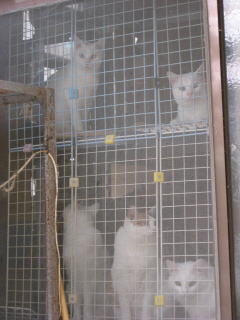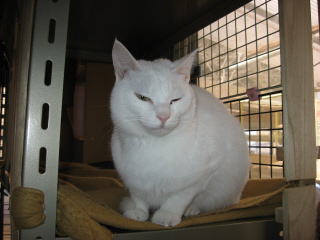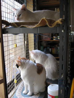→ 庭からスチール棚に集まってる猫達を撮ったよ~。(2枚とも同じ猫です。)で、白猫^(,_,*)(*,_,)^ダレダレクイズにしちゃいたい~~なんて考えてたりしてたんだけど・・・。5匹中、白猫は4匹いてるし~~なんて思ったりもしてるんだけど・・・。でも、難しいよねぇ~?網戸にアミまであって、顔が分りずらいよねぇ~?5匹中1匹は、白猫じゃないから分ると思うんだけど・・・。難しすぎるよねぇ~(´ヘ`;) う~ん・・・、どうしましょう??29日は何かあったかな??今朝の最低気温は8.9度~。最高気温は27.7度。今日も県内一の最高気温、『夏日』でした。朝から晴れ~~。少し蒸し暑く感じた一日になりました。様子見(=^-^=)達は、ウンチッチ♂スリリン♀ふく♀ホワイト♂あい♀の5匹毎日の飲み薬(=^-^=)達は、ウンチッチ♂スリリン♀ふく♀ホワイト♂の4匹4匹の薬は、缶詰に混ぜてます。只、スリリン♀は缶詰を食べないことが多いから、薬を飲ませることが難しいです。2日に1回の薬はあい♀旦那がシッカリ持って、σ(^_^)アタシがシリンジで飲ませてます。まだまだ手がかかってます。申し訳ないですが、暫くは、コメントへのお返事は無理みたいです。度々で、ごめんなさい。