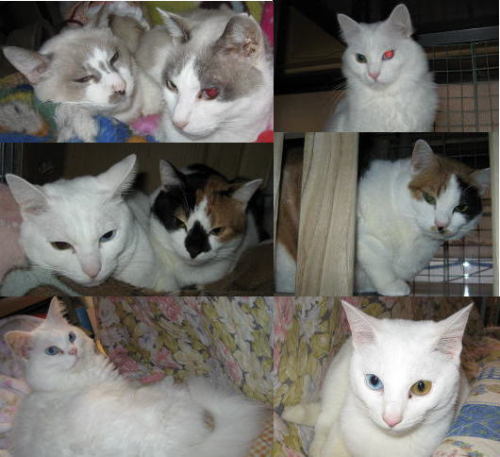 4月はにゃんたちの誕生日が多いで~す。4月14日に、皆まとめてのお祝いです。(それぞれの誕生日には、少しだけおやつ多めとか、夜ご飯多めになりま~す。)2010年4月5日生まれのナツ♀2歳です。(5日が誕生日だったので、夜ご飯の時に、皆より少し多めに焼きカツオを貰っちゃいました。^^) 2011年4月8日生まれのオッドアイの蘭♀1歳にないます。 1997年4月14日生まれの左ウンチッチ♂右シロッチ♂兄弟は15歳になります。2009年4月14日生まれの上はオッドアイの純♂下は、三毛猫のミコ♀兄妹(姉弟)は3歳になります。(14日か15日か、分からないので、14日にしました。) 2006年4月26日生まれの左オッドアイのサチ♀右三毛猫のふく♀姉妹は6歳になります。ごめんなさい!まだ、体調がイマイチで、手抜きでやってます。m(__)m5日は何かあったかな??今朝の最低気温は3.3度~。最高気温は17.9度。朝から晴れ間も覗く、雲の多い空模様。外は暖かく感じても、家の中は、まだヒンヤリしてますョ。だからホットカーペットも、湯たんぽもいるんだよね。様子見(=^-^=)達は、ウンチッチ♂スリリン♀ふく♀ホワイト♂あい♀の5匹毎日の飲み薬(=^-^=)達は、ウンチッチ♂スリリン♀ふく♀ホワイト♂の4匹4匹の薬は、缶詰に混ぜてます。只、スリリン♀は缶詰を食べないことが多いから、薬を飲ませることが難しいです。2日に1回の薬はあい♀旦那がシッカリ持って、σ(^_^)アタシがシリンジで飲ませてます。まだまだ手がかかってます。申し訳ないですが、暫くは、コメントへのお返事は無理みたいです。度々で、ごめんなさい。