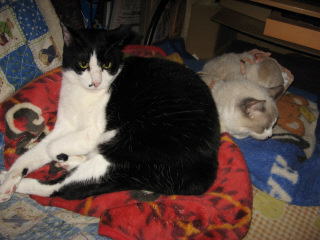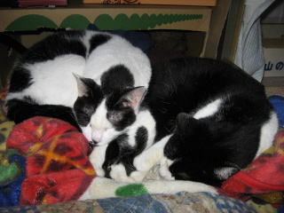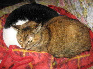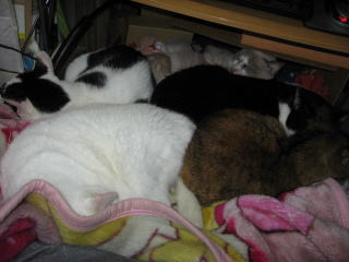 ここ数日は寒くなってるので、ホットカーペットの電源入れてま~す。^^ホカホカと暖かいですよ~。右チャッチャ♀と丸くなって寝てる白黒にゃんこはボク♂左ふく♀右スリリン♀の離れてるけど、一応ツーショット。^^手前はナツ♀奥の寅♂は寝てる。場所を変えたナツ♀と左に蘭♀がいてる。25日は何かあったかな??今朝の最低気温は9.3度~。最高気温は20.8度。朝から晴れたり曇ったり~~。昨日に比べると、暖かく感じた一日でした。様子見(=^-^=)達は、ウンチッチ♂スリリン♀ふく♀ホワイト♂あい♀の5匹毎日の飲み薬(=^-^=)達は、ウンチッチ♂スリリン♀ふく♀ホワイト♂の4匹4匹の薬は、缶詰に混ぜてます。只、スリリン♀は缶詰を食べないことが多いから、薬を飲ませることが難しいです。二日に1回の薬はあい♀旦那がシッカリ持って、σ(^_^)アタシがシリンジで飲ませてます。まだまだ手がかかってます。申し訳ないですが、暫くは、コメントへのお返事は無理みたいです。