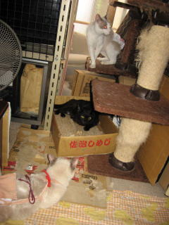 みんにゃ~同じ箱に入ってま~す。エル♀ちょこんと座ってる。ミコ♀箱がちいちゃく見えますよ~。^^蘭♀ゆっ~~たりしてる。2日は何かあったかな??今朝の最低気温は13.7度~。最高気温は26.3度。朝から晴れ~~。日中は暖かいけど、朝方はヒンヤリ肌寒いです。様子見(=^-^=)達は、ウンチッチ♂スリリン♀ふく♀ホワイト♂あい♀の5匹毎日の飲み薬(=^-^=)達は、ウンチッチ♂スリリン♀ふく♀ホワイト♂の4匹4匹の薬は、缶詰に混ぜてます。只、スリリン♀は缶詰を食べないことが多いから、薬を飲ませることが難しいです。二日に1回の薬はあい♀旦那がシッカリ持って、σ(^_^)アタシがシリンジで飲ませてます。まだまだ手がかかってます。申し訳ないですが、暫くは、コメントへのお返事は無理みたいです。