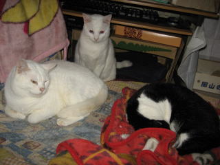 肌寒いと暖かい場所がいいにゃ~ウンチッチ♂コタツの下の毛布の上にいてる。お母さんのひざ掛け毛布の上で、手前のサチ♀は、こっち向いてくれた。その上のボク♂その奥のチャッチャ♀は寝てる。奥にいてるチャッチャは、分りずらいかも~~。遅くなりました。m(__)m9月20日21日22日の突然の白にゃんこ^(,_,*)(*,_,)^ダレダレクイズのプレゼントは、これで~す。今回は、いつもと少し違った品になりましたが・・・。正解のニャンタaiko さ~ん大変遅くなりましたが、定形外で2日に発送します。2~4日で届くと思います。届くまで、もう少し待っててくださいね。1日は何かあったかな??今朝の最低気温は17.4度~。最高気温は23.4度。午前中は、曇り空。お昼前から晴れ間も覗くけど、雲の多い空模様になりました。今日も肌寒い一日になりました。昨日今日と肌寒くなったせいなのか?足腰が冷えて・・・。夜になってからお腹が痛くなり、トイレに行く回数も増えて・・・。申し訳ないですが、本日は、皆様方の所へお邪魔することができなかったです。m(__)m明日2日にお邪魔させて頂きます。もう暖かくして寝ます。様子見(=^-^=)達は、ウンチッチ♂スリリン♀ふく♀ホワイト♂あい♀の5匹毎日の飲み薬(=^-^=)達は、ウンチッチ♂スリリン♀ふく♀ホワイト♂の4匹4匹の薬は、缶詰に混ぜてます。只、スリリン♀は缶詰を食べないことが多いから、薬を飲ませることが難しいです。二日に1回の薬はあい♀旦那がシッカリ持って、σ(^_^)アタシがシリンジで飲ませてます。まだまだ手がかかってます。申し訳ないですが、暫くは、コメントへのお返事は無理みたいです。