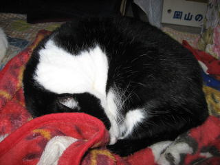 ボク♂丸くなって寝てる。寅♂もう少しで丸くなったよねぇ~。28日から1泊での実家行き~28日は、昨日の日記に書いたように、前を走ってる普通列車の人身事故で、1時間強の停車にあい、岡山発宿毛行のJR特急列車南風は、突然の高知駅までの運行になり、その先に行くσ(^_^)アタシにとっては、大迷惑~。指定席とって乗ってるのに、高知駅で降りないといけないなんて~。で、各駅停車で行くはめになって~~。(○`ε´○)プンプン!29日の帰りは、今日は昨日のことはないだろうなぁ~2日も続かないよねぇ~と、不安を持ちながらJR特急南風に乗ったんだけど・・・。もう後20~25分ぐらいで岡山だぁ~と思ってたら。。。停車してた駅から動かない~~。ヾ( ̄o ̄;)オイオイ、まさか?まさか~?岡山発の特急しおかぜ?だったかな?が、早島付近の線路の上で止まってる~との放送が~~。(゜゜;)エエッ~(='□'=)ウッソー!?線路の点検後、30分遅れで、発車したのはいいけど、ノロノロ運転。またまた放送で、前にいる列車の渋滞で、ノロノロ運転になってますとのこと。岡山到着が30~40分遅れ、1時間に1本しかない出雲行き特急を待って、帰ってきました。はぁ~・・・(´・`)、28日は2時間遅れで到着で、29日は1時間遅れの到着になりました。本当に大疲れの、(;´ρ`) グッタリの2日間になりました。29日は何かあったかな??今朝の最低気温は11.0度~。最高気温は19.8度。朝から晴れたり曇ったり~。こちらは、気温が上がらず肌寒かったそです。高知では、ポカポカと暖かかったです。大疲れでε= (++ ) バテバテ!!帰ってきたら、猫達の雑用で、バタバタ。m(._.*)m ゴメンネ、お邪魔することができないです。様子見(=^-^=)達は、ウンチッチ♂スリリン♀ふく♀ホワイト♂あい♀の5匹毎日の飲み薬(=^-^=)達は、ウンチッチ♂スリリン♀ふく♀ホワイト♂の4匹4匹の薬は、缶詰に混ぜてます。只、スリリン♀は缶詰を食べないことが多いから、薬を飲ませることが難しいです。二日に1回の薬はあい♀旦那がシッカリ持って、σ(^_^)アタシがシリンジで飲ませてます。まだまだ手がかかってます。申し訳ないですが、暫くは、コメントへのお返事は無理みたいです。