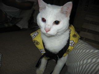 おかあしゃんが、こんなのを買ってきちゃいました。で、着せられちゃいました。似合ってるかにゃ~?σ(^_^)アタシには、少し大きいよ~おかあしゃん。猫柄のちゃんちゃんこ~寒がりさんには、ピッタンこ~。ちゃんちゃんこのモデルになってくれた蘭♀ちゃ~~ん、ありがとにゃ~。蘭♀は、(^^?)なぜ?か?嫌がらずにスンナリと着てくれるんだよね。10分や20分ぐらいなら、ちゃんと着てくれてるんだよね。だから蘭に着て貰ったんだよ~。^^30日は何かあったかな??今朝の最低気温は18.5度~。最高気温は23.0度。台風の影響で、昨夜から降りだしたシトシト雨は、お昼過ぎには上がったョ。その後は晴れたり曇ったり~。夜に、小雨がパラついたみたい。肌寒い一日になりました。30日は中秋の名月だったけど、こちらでは雲に覆われて、残念ながらお月様は出てなかったです。様子見(=^-^=)達は、ウンチッチ♂スリリン♀ふく♀ホワイト♂あい♀の5匹毎日の飲み薬(=^-^=)達は、ウンチッチ♂スリリン♀ふく♀ホワイト♂の4匹4匹の薬は、缶詰に混ぜてます。只、スリリン♀は缶詰を食べないことが多いから、薬を飲ませることが難しいです。二日に1回の薬はあい♀旦那がシッカリ持って、σ(^_^)アタシがシリンジで飲ませてます。まだまだ手がかかってます。申し訳ないですが、暫くは、コメントへのお返事は無理みたいです。