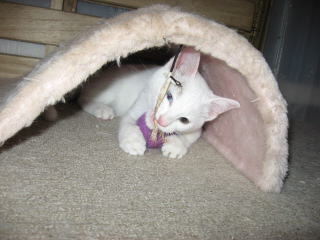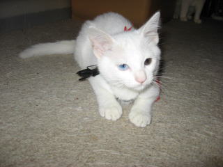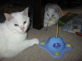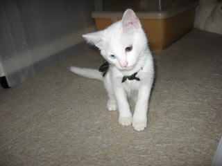 わたちマリ♀でちゅ。やっとみんにゃと遊べるようになりまちた。2週間後の回虫の滴下で、虫がでなかったでちゅ。でも、紐付きでちゅ。( ̄  ̄)(_ _)ウンウン、我が家の恒例ですよ~。小さいにゃんこの場合は、隙間に入られると、分りずらいから、紐付きにして、走り回ると、大きいお兄ちゃん、お姉ちゃんが追っかけて、すぐ居場所が分るからねぇ~。我が家のにゃんこは、小さい時は、紐付きだったんだよ~。^^オッドアイのマリ♀紐付きになったから、慣れてなかったから、最初はおとなしかったんだけど・・・。マリ♀いないいないチューを前に置くと、遊びだした~。後ろに白にゃんこもやってきた~。マリ♀いないないチュー、目で追ってますよ~。後ろの白にゃんこ、近づいてきた~。マリ♀いないいないチューに噛みつこうとしてるのかな?後ろの白にゃんこは、見てるかな?マリ♀いないいないチューの先っぽを見てる~。後ろから来てた白にゃんこは、健♂でした。マリ♀の匂いを嗅いでるかな?10日は何かあったかな??今朝の最低気温23.4度~。最高気35.9度。朝から晴れ~~で、猛暑日~。もうε-(´o`;A アチィ。暑過ぎる日が続いてる~。様子見(=^-^=)達は、スリリン♀ふく♀ホワイト♂デコ♀ボク♂の5にゃん毎日の飲み薬(=^-^=)達は、スリリン♀ふく♀ホワイト♂デコ♀ボク♂の5にゃん5にゃんの薬は、缶詰に混ぜてます。まだまだ手がかかってます。申し訳ないですが、暫くは、コメントへのお返事は無理みたいです。