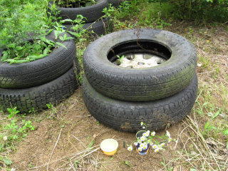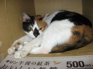 7月10日の午後8時半頃、買い物から帰って、鍵を開け、窓を開けて、いつものようにお父さんが、買い物の荷物を運び込むのを待ってたけど、いつまで待ってても、荷物が運び込まれない~。なので、庭に出ると・・・。お父さんの足元、サンダルや靴下にじゃれてる?噛み付いてる?子猫がいた~。離しても、離しても、足元にくっ付いて離れない~~。荷物を運び込んでると、一緒にくっ付いてくるし・・・。最後は、玄関から中に入ってきた~。母親にゃんこの姿が見えないけど、移動中?またまた、はぐれたの~?それとも留守中に、カリカリフードを食べに来てて、母親にゃんこだけ~先に帰ったの~?玄関から入ってきたので、お父さんが、人に寄ってくるし、警戒心がない猫は、野良では生きていけないよ~と、言うので、我が家のにゃんこにしちゃいました。一先ず篭の中に入れて、ケージを組み立て、フードに水容器、トイレと湯たんぽ入れて。。。お風呂場に連れて行き、ノミ・ダニ駆除剤のスプレーをして、ケージの中へ。12日に獣医さんとこへ連れて行き、検査してプロフェンダースポットを滴下して貰い、帰ってきました。(滴下した夜と翌日に回虫が出た)2週間後に又プロフェンダースポットを滴下したけど、虫は出なかった。ε-(´▽`) ホッ!23匹目のにゃんこは、ブルーのお目目のアキ♀ニャンタaiko さんから、名前の由来は~?と、聞かれたので。少し分りずらいですが、毛が少しだけ~ふわふわしてます。同じお目目のにゃんこのナツ♀と似てるので、季節の春夏秋冬から、春生まれだけど、ナツ。ナツより後に入ったので、春生まれだけど、アキになりました。^^マリ♀の場合は、名前の候補は色々あって・・・。最終エリに決まってたけど、お姉ちゃんにエル♀がいたので、エル・エリは呼び間違えやすい~と言うことで候補の中にあった、マリ♀になりました。25日の新入り子猫クイズ~5問正解はなし~~。4問正解の方はにゃゃ~~ん♪さんオメデト♪(*⌒ー⌒)o∠★:゚*PAN!日記書いてるけど、(^^?)なぜ?か?動きが悪くて、時間がかかってます。途中から消えそうになるし、文字の変換ができなくなるし・・・。(メモで書いて、コピー貼り付けてます。)なので、30日にお邪魔させてくださいね。m(__)m29日は何かあったかな??今朝の最低気温23.4度~。最高気温30.8度。朝から雨が降ったり止んだり。時折、薄日も射してた。蒸し蒸しの蒸し暑い一日になりました。様子見(=^-^=)達は、スリリン♀ふく♀ホワイト♂デコ♀ボク♂の5にゃん毎日の飲み薬(=^-^=)達は、スリリン♀ふく♀ホワイト♂デコ♀ボク♂の5にゃん5にゃんの薬は、缶詰に混ぜてます。まだまだ手がかかってます。申し訳ないですが、暫くは、コメントへのお返事は無理みたいです。